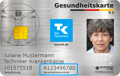 Ihre Versicherungsnummer finden Sie gewöhnlich auf Ihrer Krankenkassenkarte, wie auf diesem Beispiel, blau umrandet.